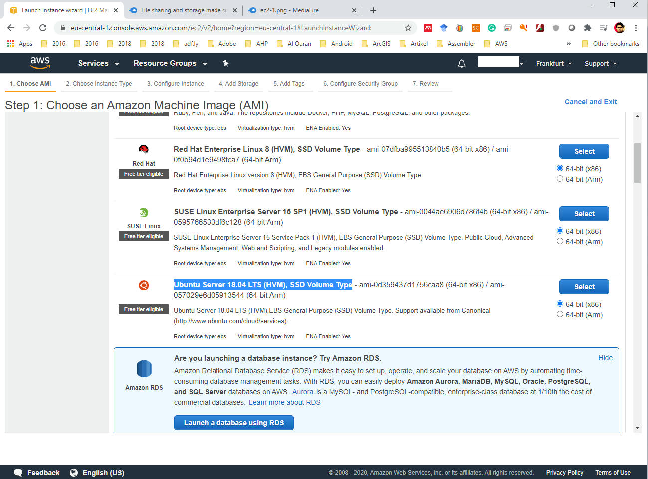 - Pilih Amazon Machine Image (AMI). misal dalam contoh ini saya akan menggunakan Ubuntu Server 18.04 LTS (HVM), SSD Volume Type. kemudian klik button select.
